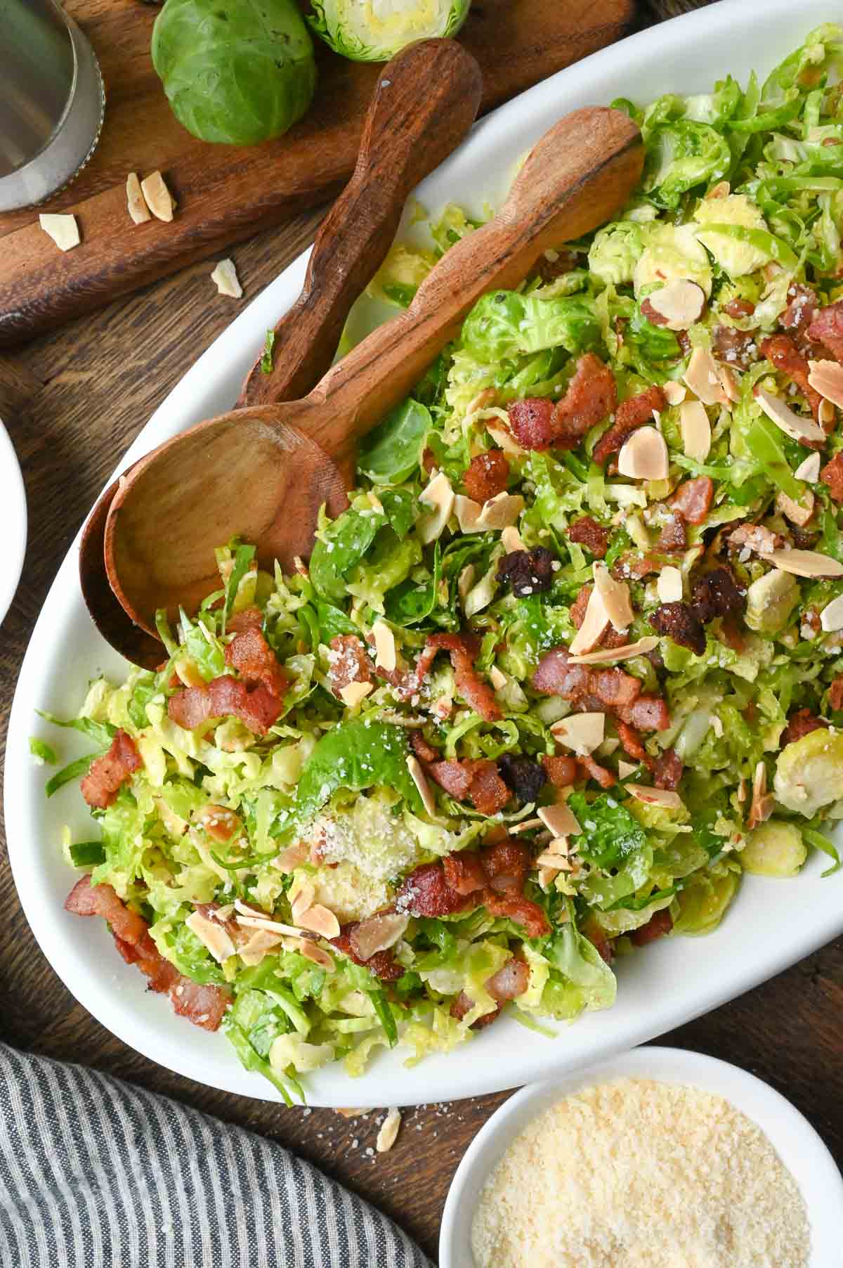 - Add the shredded Brussels, green onions, Parmesan cheese, almonds, and crispy bacon to a large bowl. Refrigerate until ready to serve.